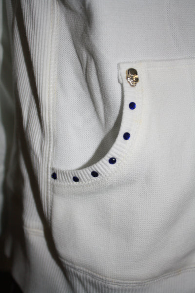 60% Cotton, 35% Polyester, 5% Spandex Same stones color Cobalt Blue Stones are applied 3/Rows of stones down the both arms & in front of the pocket area........Hoodie jacket runs big is Size Small 4-6, Medium 8-10, Large 12-14, XL 16-18,